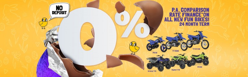 *0% P.A. comparison rate is available on all new PW50, TT-R50E, TT-R110E, YFZ50, Raptor 90, Grizzly 90, Raptor 110, Grizzly 110 on a term of 24 months. This includes a $0 application fee, $0 deposit, a $0 per month account keeping fee. A Dealer Administration Fee may be applicable. Dealer freight, pre delivery and accessories costs may apply and can be included in the finance application. The Comparison rate is based on a 3-year secured fixed rate consumer loan of $10,000. WARNING: This comparison rate is true only for the examples given and may not include all fees and charges. Different terms, fees or other loan amounts might result in a different comparison rate. Offer is valid to approved personal applicants on consumer loans and commercial buyers on chattel mortgage and hire-purchase contracts. Offer valid for applications received from 01/01/2026 and approved on or before 30/06/2026 and settled no later than 31/07/2026, while stocks last. Credit criteria, fees, charges, terms and conditions apply. Finance is provided by Yamaha Motor Finance Australia Pty Ltd ABN 29 101 928 670 Australian Credit Licence Number 394553.